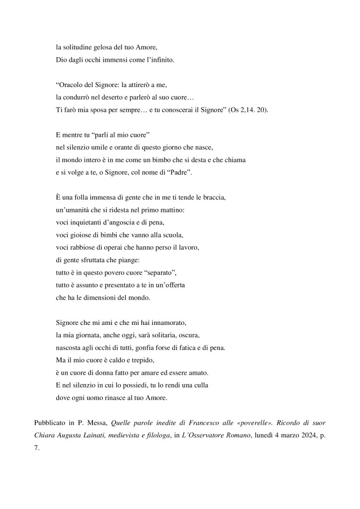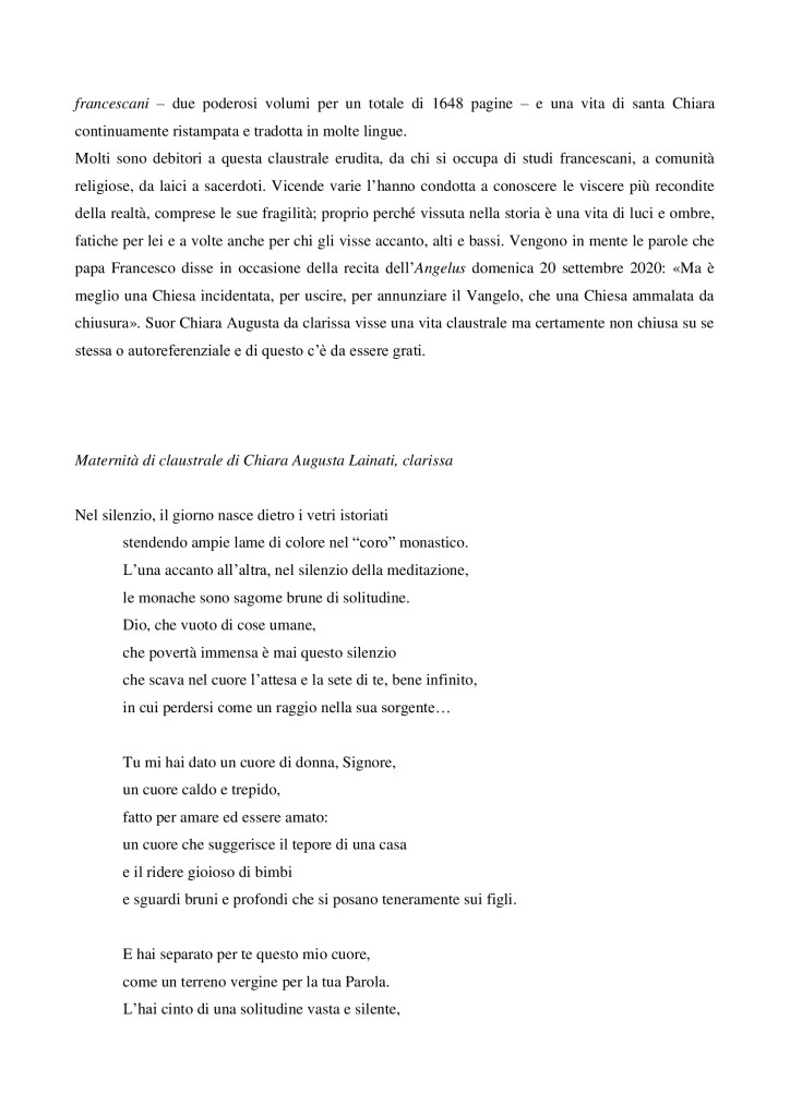 Con stupore grato e orante, riconosciamo una speciale carezza di Dio in questo transito al cielo, con la “buona scorta” di S. Agnese di Boemia, di questa sorella povera, presenza feconda e significativa per l’Ordine e per la nostra federazione.