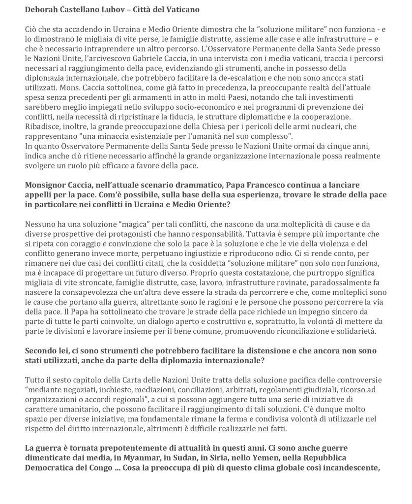 Mons. Caccia: con la “soluzione militare” non ci sarà futuro per il Medio Oriente e l’Ucraina
